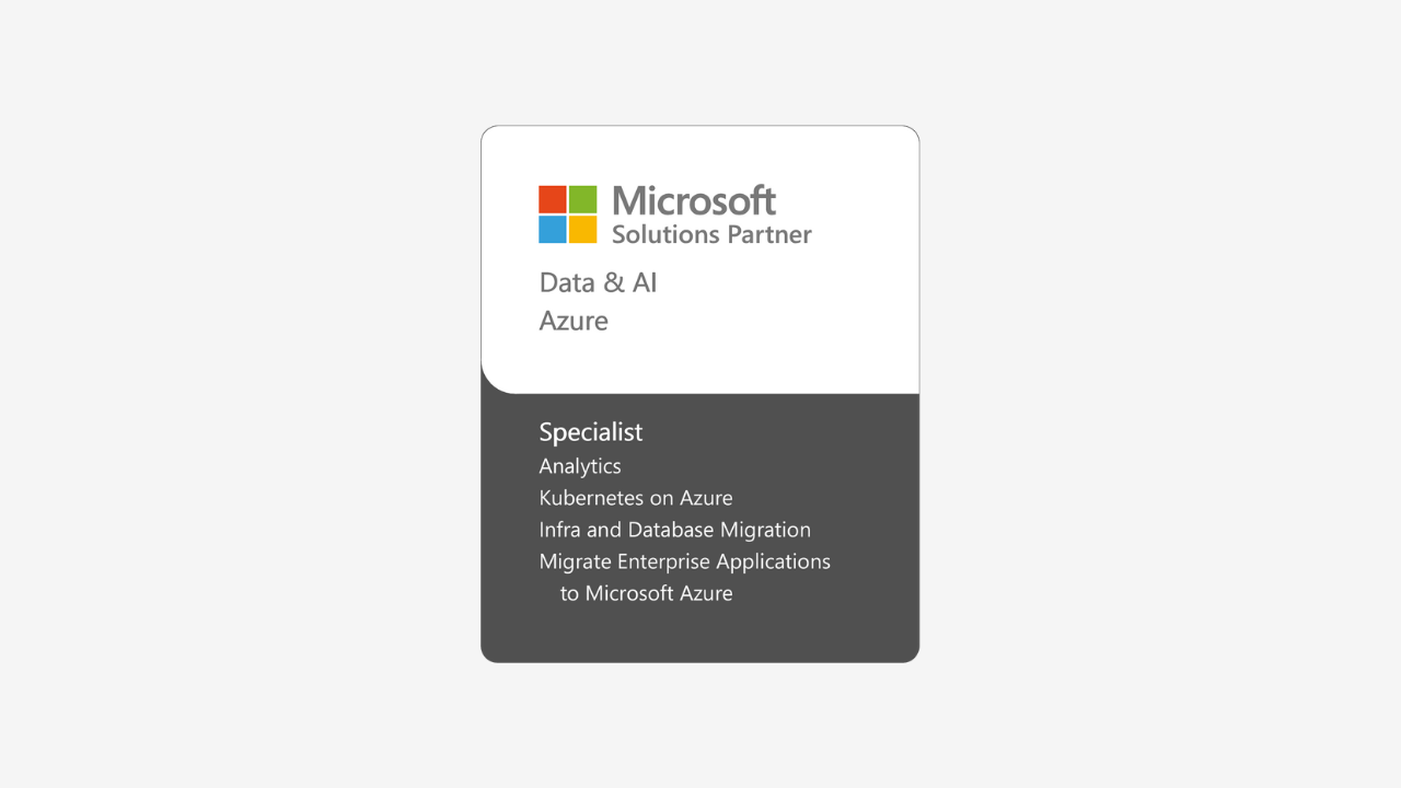 This Microsoft Solutions Partner Specialist badge highlights our capabilities in delivering Data & AI solutions on Microsoft Azure, spanning analytics, Kubernetes-based data platforms, and infrastructure and database migrations. It reflects our experience in supporting enterprises with modern data architectures and the migration of business-critical applications to Azure.